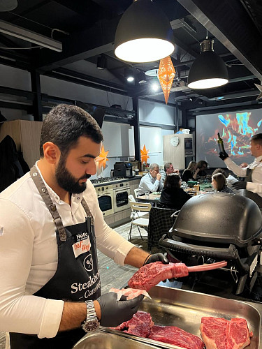 В этом сезоне мастер-классы проводим в новом пространстве — Korting Sky Room в Артплей с панорамным видом на Москву. Наша команда тщательно раскрывает все тонкости процесса приготовления стейков: мы расскажем, как выбрать мясо, как приготовить стейк ресторанного уровня дома, и с чем его подать. В расслабленной атмосфере мы прекрасно проводим время, не увиливаем от вопросов и угощаем прекрасным вином — обязательно приходите.