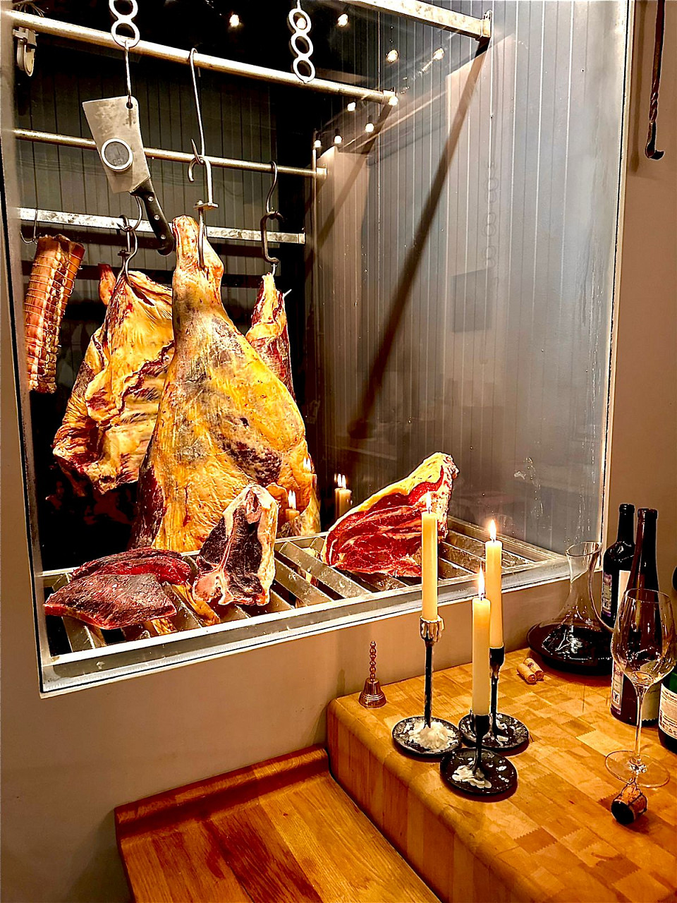 - Меню: Три вида тартара из мраморной говядины, классические и альтернативные стейки влажного и сухого вызревания, три вида соуса для стейка, гарниры и десерт.