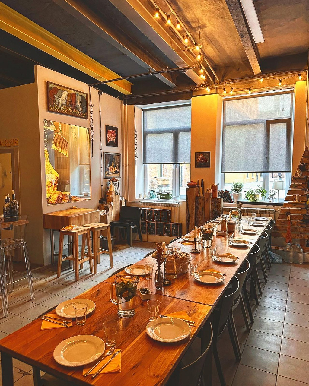 - Меню: Три вида тартара из мраморной говядины, классические и альтернативные стейки влажного и сухого вызревания, три вида соуса для стейка, гарниры и десерт.